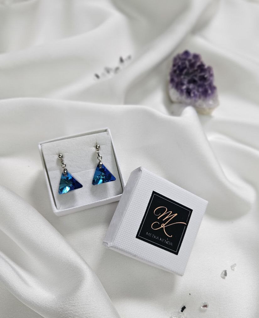 Turkizno modri uhani s  kristalom Swarovski v obliki trikotnika  in srebrom. Kristal se zelo sveti in spominja na barvo morja v južnih obmorskih krajih.