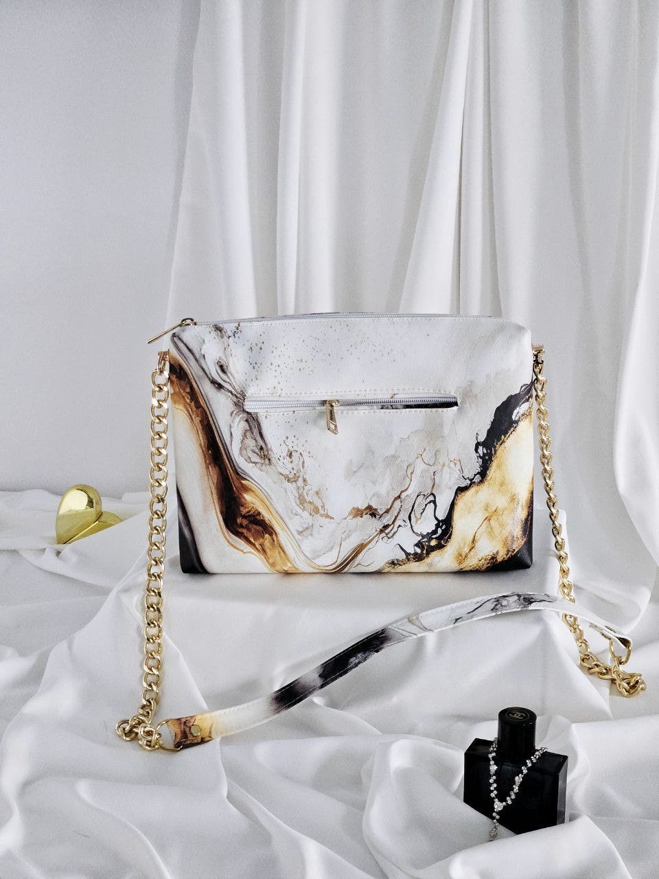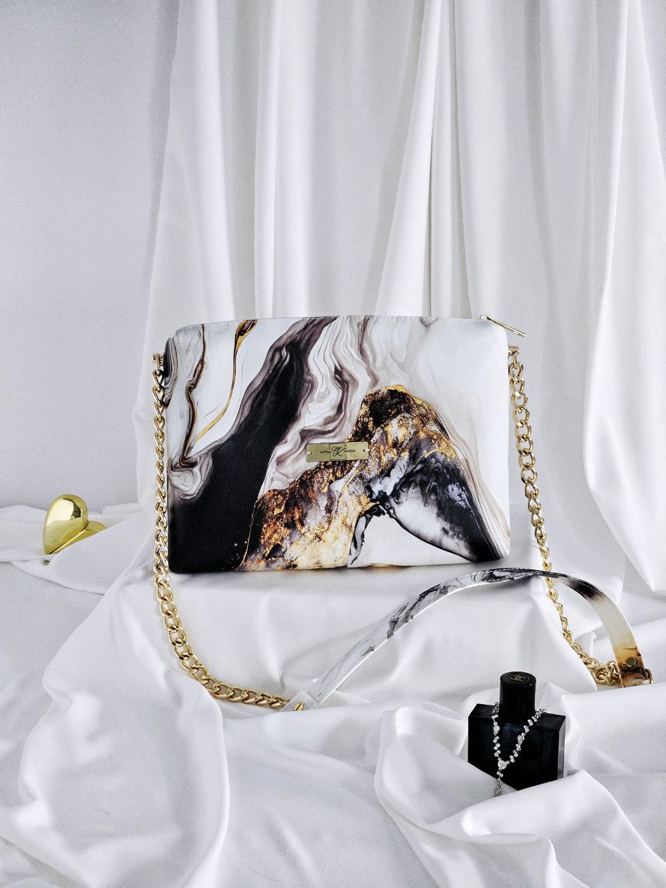 Torbica je ročno izdelana. Ima dve zadrgi, eno v notranjosti in eno na zunanji hrbtni strani. Zapira se z zadrgo. Dodana ji je galvanizirana aluminijasta verižica, ki ne potemni in ne pušča sledi, hkrati pa torbici doda poseben čar.