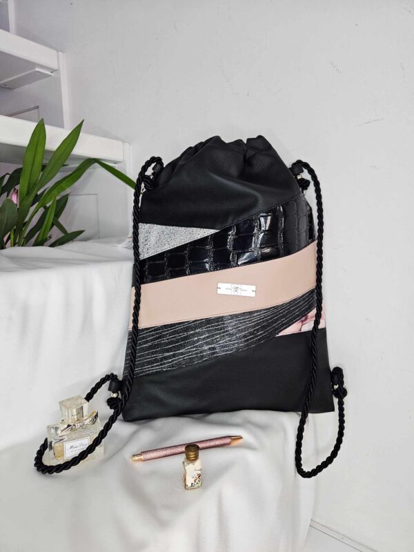 k z vrvico v črni barvi je pravi modni dodatek, ki združuje eleganco in funkcionalnost. Ročno izdelan iz 100 % eko usnja, ta nahrbtnik vključuje premišljeno oblikovane detajle in strukture, ki mu dodajajo unikaten videz. Dodatki v nežni roza barvi torbi dajejo mehkobo in ženstvenost, medtem ko zvite naramnice s satenastim videzom prinašajo prefinjen minimalističen pridih.