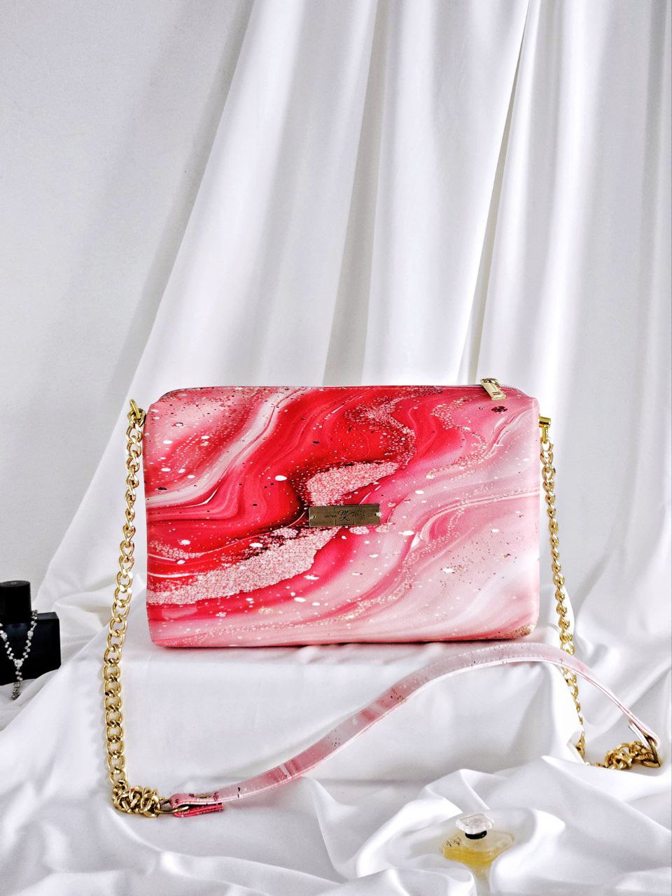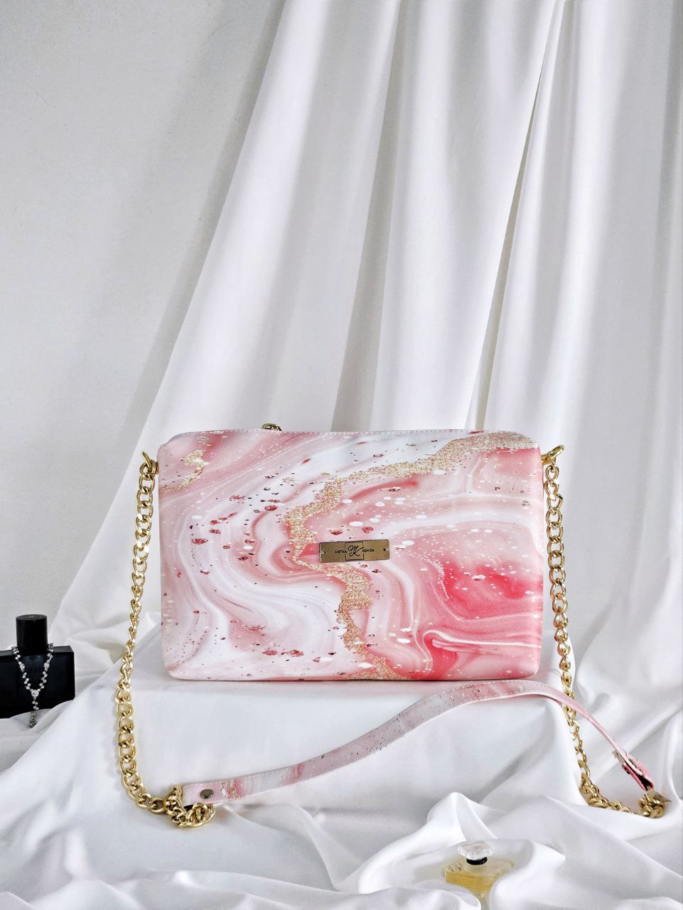 Manjša, nežna torbica z rahlim efektom bleščic ima na eni strani bolj umirjen videz, na drugi pa izrazitejši rožnat ton za trenutke, ko želiš izstopati. V notranjosti ima žep za kozmetiko ali ključe, ki se zapira z zadrgo, prav tako se z zadrgo zapira tudi torbica sama.