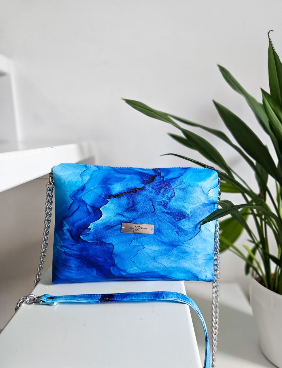 Tale modna torbica iz tiskanega eko usnja je primerna naravno za poletne dni. Spominja na barve morja in neba in ti omogoča prijetne , igrive kombinacije. Srebrna galvanizirana verižica ji doda eleganco in ji omogoča neskončne kombinacije za različne namene. Lahko jo nosite v službo , na sprehod , poslovno kosilo in prav tako za večerne izhode in kakšno bol posebno priliko , kjer moramo bit bolj urejene . Tako kot večina unikatnih torbic iz edinstvene kolekcije Colorful ima tudi blue merble zadaj na hrbtni strani žep ,ki se zapenja z zadrgo. Primeren za shranjevanje manjših predmetov kot so kluči , mobilni telefon in podobno. Prav tako ima žep v notranjosti ,ki se prav tako zapenja z zadrgo. Lahko jo nosimo čez telo na eno ramo in v roki. S to modno ,elegantno vendar drzno unikatno torbico zagotovo ne boste ostali neopaženi in boste v trendu z modnimi smernicami.