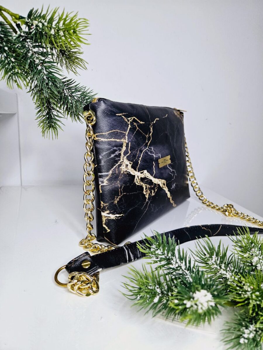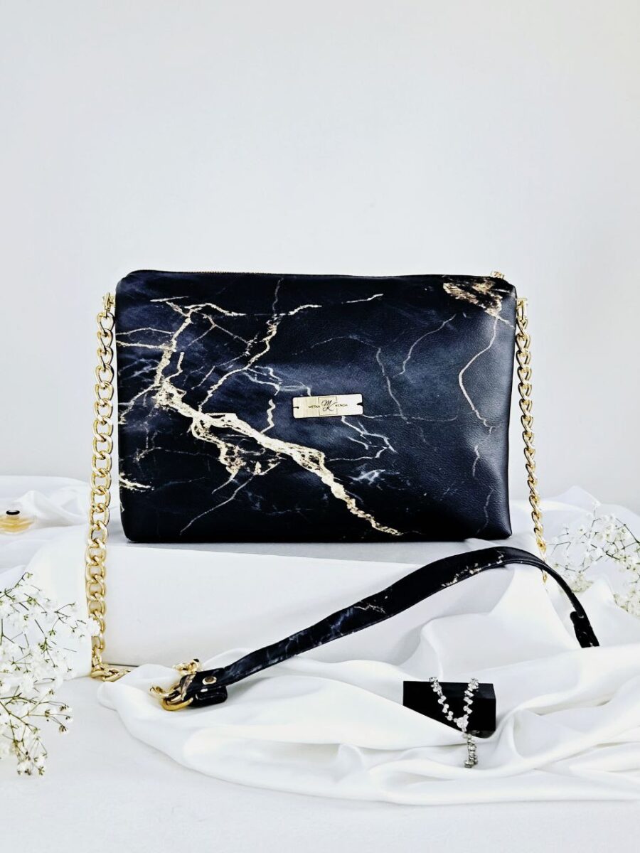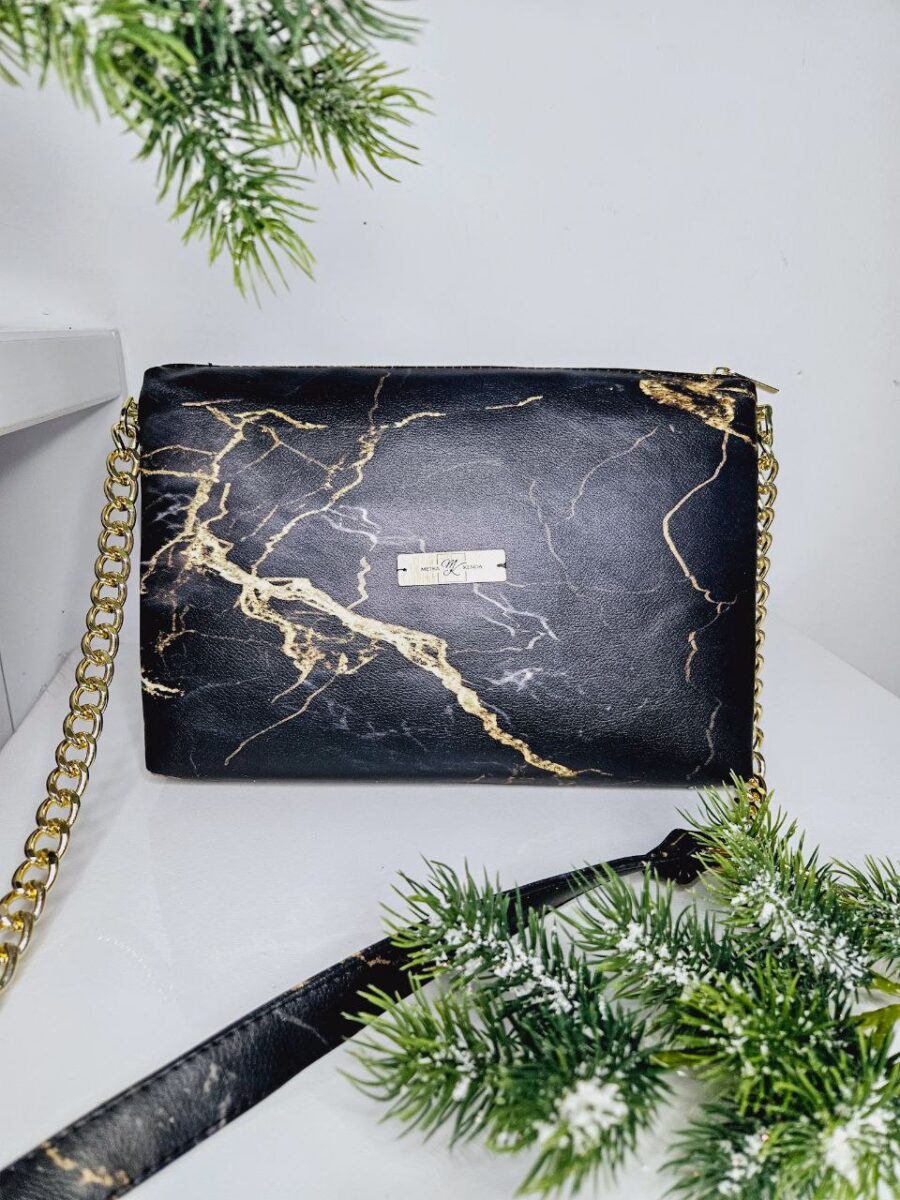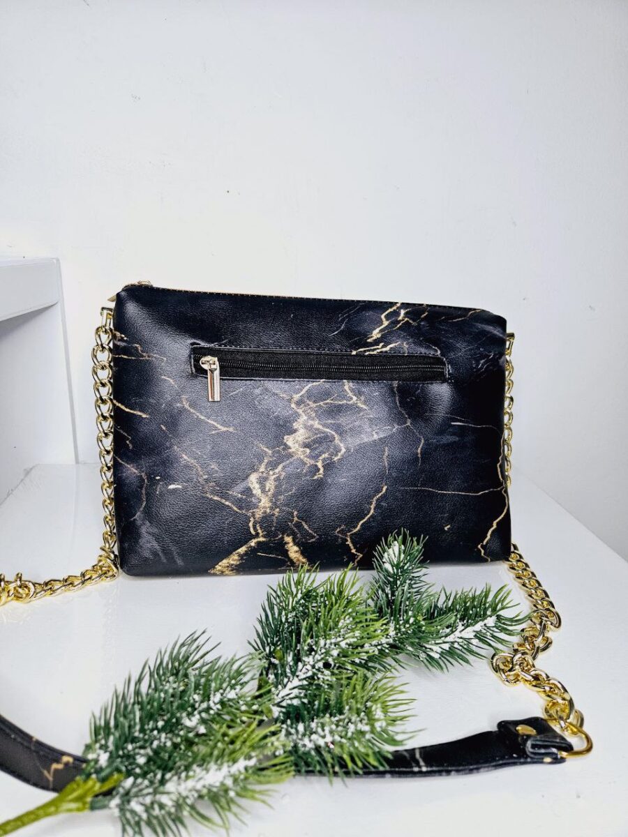 Manjša ženska torbica iz modnega črnega eko usnja z zlatim vzorcem, ki spominja na žile v marmorju. Primerna je tako za vsakodnevno uporabo kot tudi za bolj posebne priložnosti, saj zlata verižica lepo popestri njen videz in razširi možnosti uporabe. Torbica ima dva žepa na zadrgo – enega v notranjosti in drugega na hrbtni strani torbice. Tako boste imeli vse potrebne stvari vedno pri roki in lepo organizirane. Odlično se poda tako h kavbojkam kot tudi k manjši večerni oblekici. Nosi se lahko v roki ,na eni rami ali čez telo.