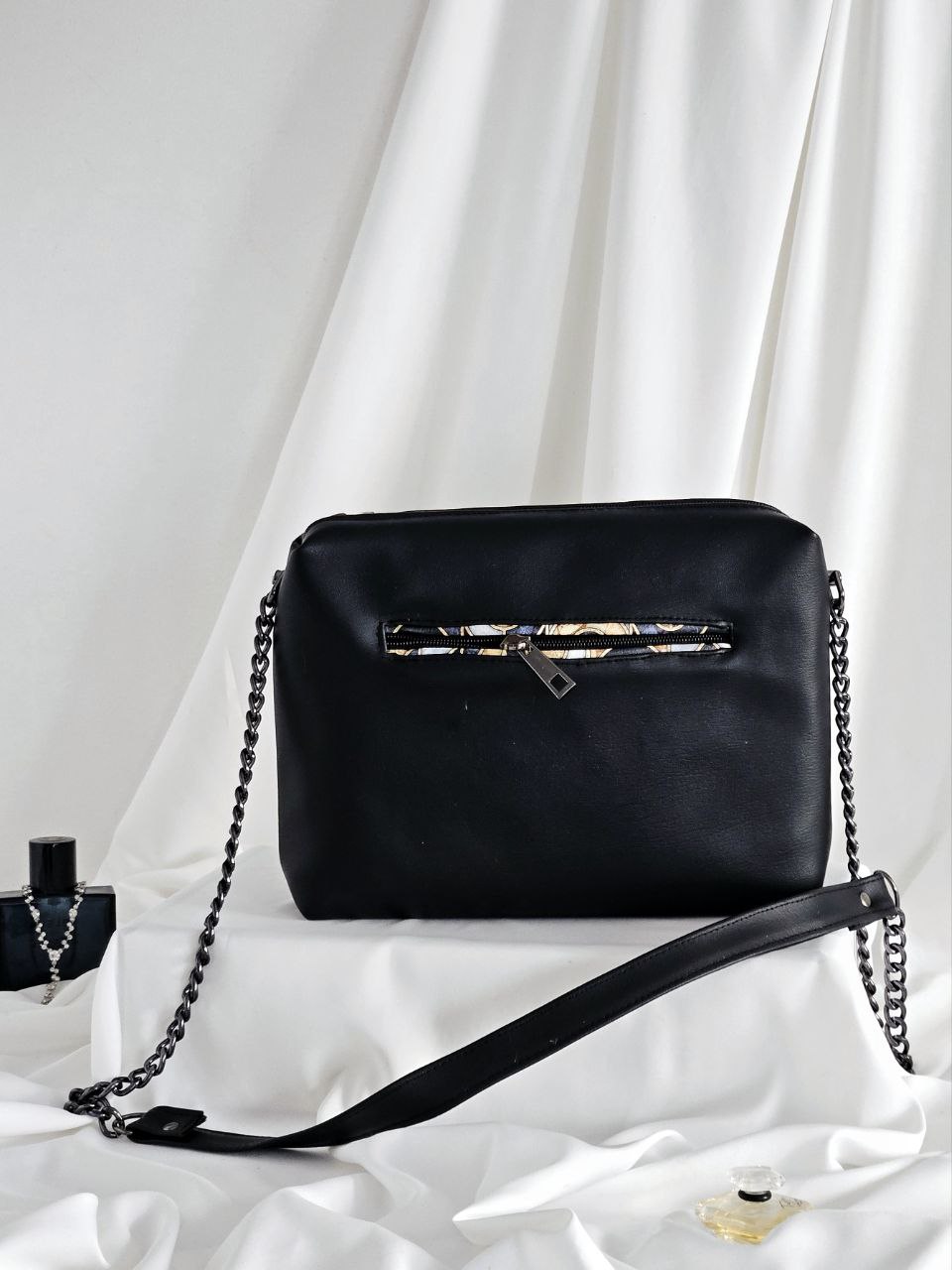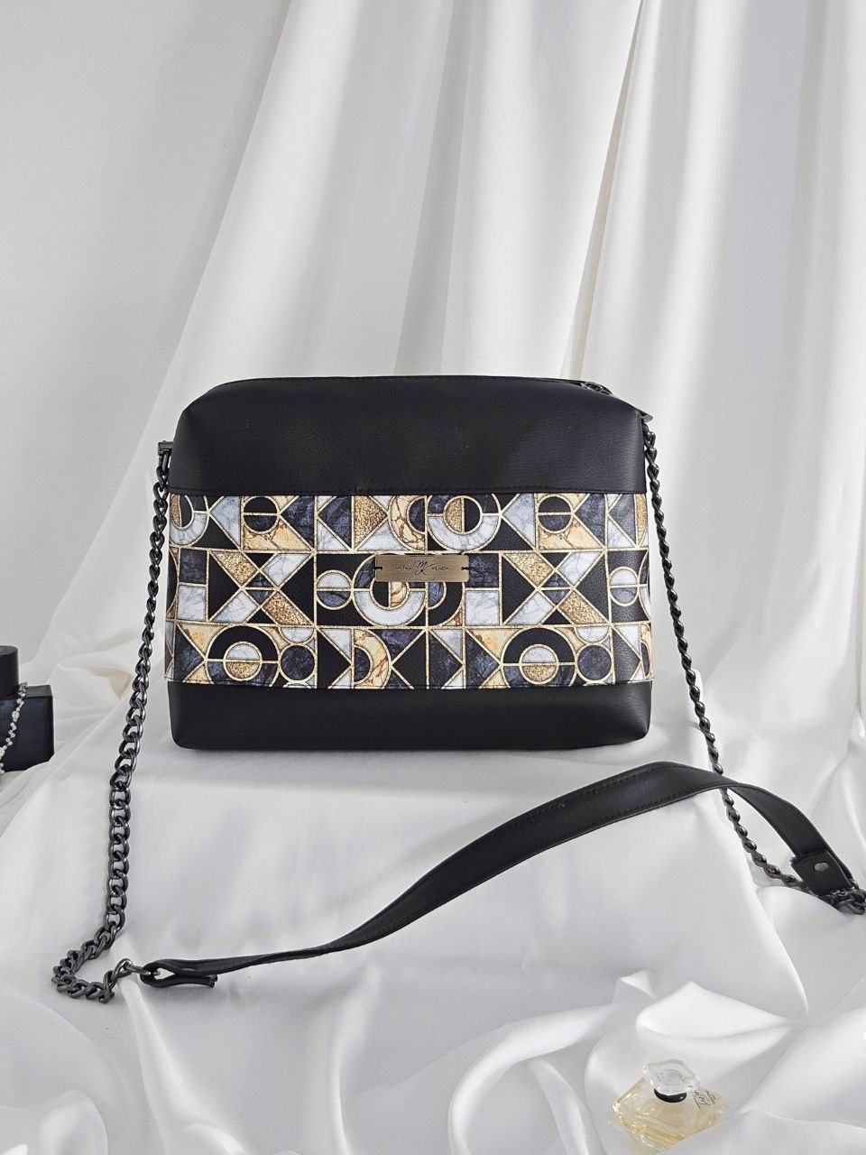 Unikatna ročno narejena ženska torbica,ker se srečata eleganca in geometrijske oblike.Torbica se zelo lepo kombinira na vse zemeljske tone tako kakor tudi na črno in belo. Je srednje velikosti in nekoliko bolj globoka od ostalih. Posebnost ji doda galvanizirana verižica v kovinsko črni barvi. Nosi se lahko na rami ,čez telo ali v roki. Na hrbtni strani in v notranjosti ima žep ki se tako kakor torbica zapirata z zadrgo. Zadnji žep je zelo hvaležen za vse stvari kibi jih želeli imet pri roki. Zagotovo bo postala vaša najljubša sopotnica zaradi stila in njene prostornine kljub manjši velikosti.