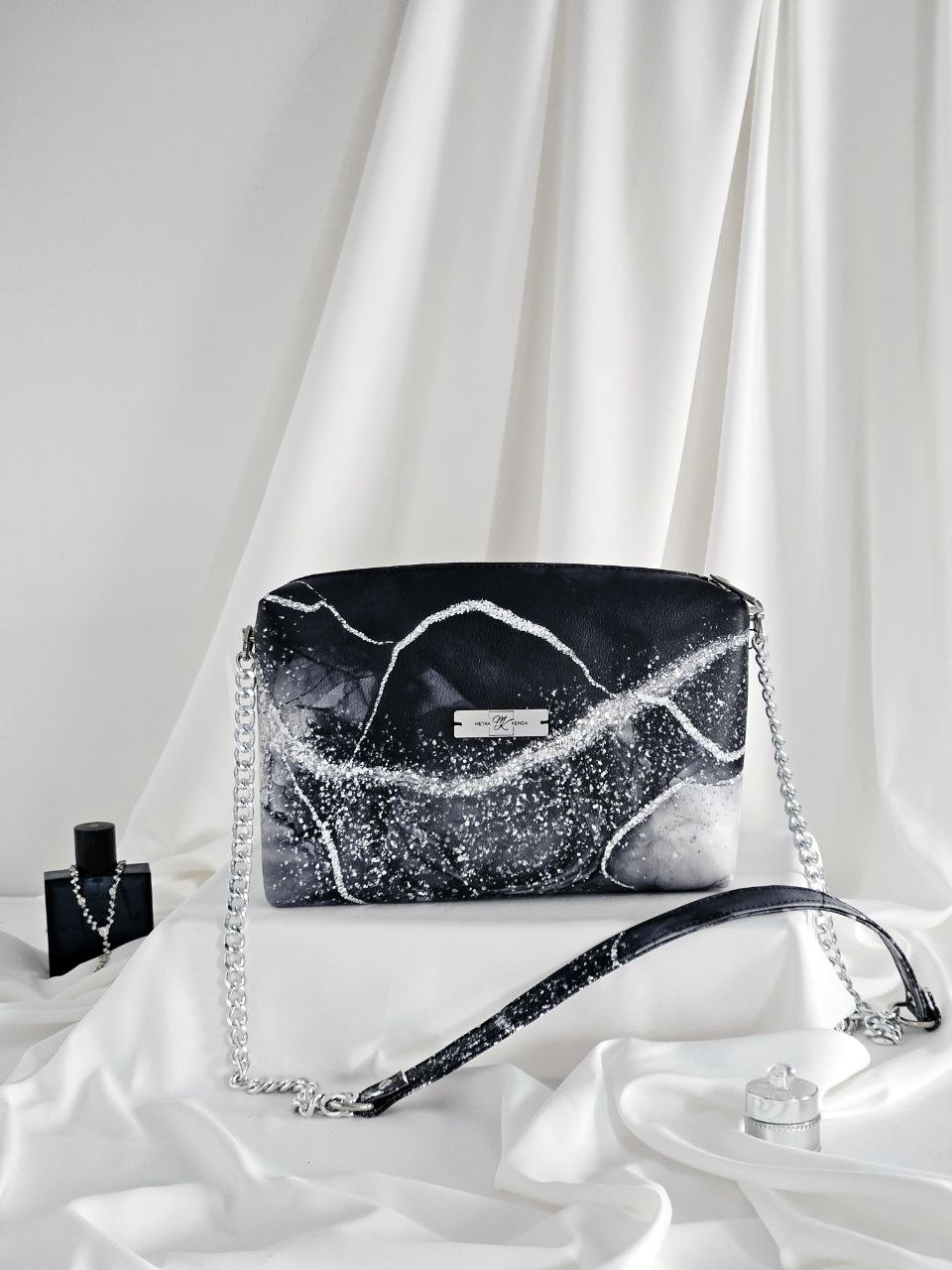 Unikaten srebren vzorec na črnipodlagi te torbice spominja na bleščice.